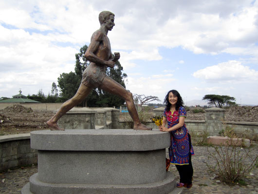 ランチのあとは、「エチオピアで絶対にすべきこと」の一つ、アベベ選手のお墓詣りを決行した。アベベ選手といえばローマオリンピック(1960年)と東京オリンピック(1964年)の二回連続、マラソンで優勝した伝説の選手である。エチオピア皇帝の親衛隊であり、裸足で走るスタイルで知られた。人生後半は悲劇続きだったようで、37歳で交通事故に遭い下半身不随、41歳で脳出血により逝去。砂っぽい墓地の中にぽつんと立つ等身大の像が、どこか荒涼たる雰囲気を醸していた。