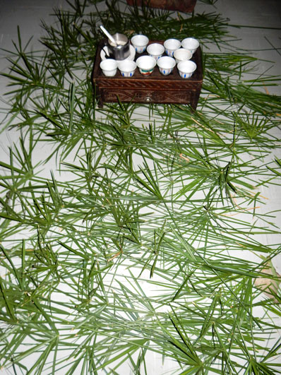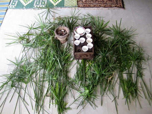 ケータマという植物の葉が敷かれ、コーヒーセレモニーの