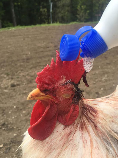 鶏が兄弟喧嘩をしたようです。この雄鶏がトサカと頭に傷を負い、