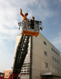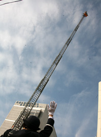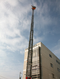 はしごを伸ばし切って、ついに地上45メートルに到達した瞬間(右写真)。