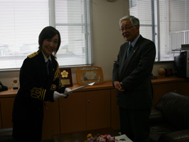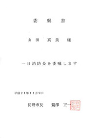 | このあと、すでに局長室で待機してくださっていた鷲澤正一長野市長から「依嘱書」を交付され、いよいよ一日消防長としての1日のスタートです! |