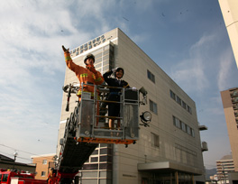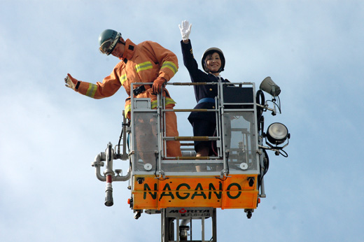 今回の試乗では、はしごが地上20メートルと30メートルに達した段階で消防士さんが、