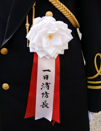 着ぐるみの上からでは制服が着られないので「一日署長」のたすきを斜め掛けにし、