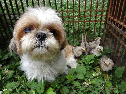 これは今年6月の写真。5羽のヒヨコたちを守るブースケ氏。