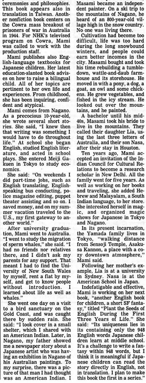 内容的には多少の間違いがありますが(例:この次に出版予定のSFファンタジーのタイトル名が、何故か『3歳までに英語の種をまきなさい』になっていたり、明治学院が明治学園だったり、数字の間違いもちらほら)、全体としては、たいへん好意的に書いていただいています。 |