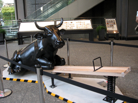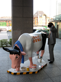 東京駅正面で汗だくになっていた牛くんと牛の背中に新聞を広げて読み耽っていたオジサンに