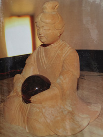 (左)獅子の頭の上の弁天像。両手で水晶を抱えていらっしゃいます。尚、このアングルの写真は