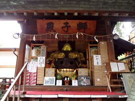 本殿に向かって左に鎮座する雌獅子。頭頂に弁天さまが見えています。