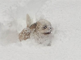 まつげまで凍らせて雪の中で遊ぶクースケ。