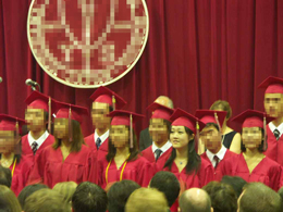 あの房は「タッセル=tassel」と言って、卒業式が終了した瞬間に(本人の)左から右へ移動させる伝統なんですって(まあ、こんなことを知っていても一生使う機会はないでしょうが、欧米の学校に関するトリビアということで覚えておいていただければと(笑))。