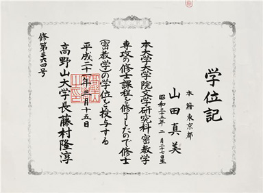 弘法大師空海が日本に密教をもたらした年から数えて1200年目に当たる2006年に、高野山大学大学院修士課程(密教学専攻)に進学し、さまざまな角度から真言密教を学んで参りましたが、お蔭さまでこのたび一定のカリキュラムを修了し、密教学修士を名乗ることを許されました。