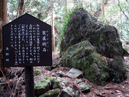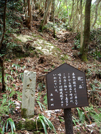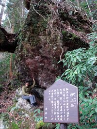“弘法大師の三石”のひとつ、袈裟掛石。弘法大師空海がこの石にお袈裟を掛けたと言われ、この