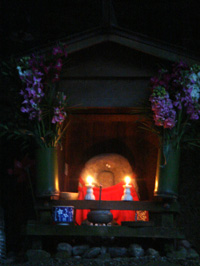 (左)遠く紀ノ川を臨む (右)蝋燭に火が点って温かくなったお地蔵さん