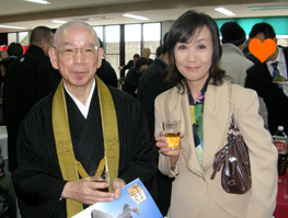 (左)入学以来お世話になった前学長の生井智紹先生と (右)同級生と歓談中(2人ともお坊さんです) |