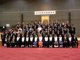 (左)教授陣、御来賓、大学・大学院の卒業生全員による記念撮影
