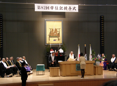 ひとりひとり名前を呼ばれ、壇上で学長から学位記を授与されました。