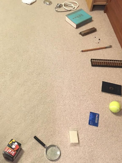 普通はせいぜい5~6個のアイテムしか置かないようですが、我が家ではそろばん、聴診器、ルーペ、絵筆、国語辞典、楽器、テニスボール、パスポート、花札などなど全部で14個のアイテムを置いてみました。