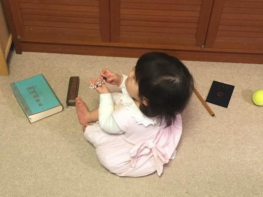 色々な選択肢を与えるために14個のアイテムを置いておいたところ、孫娘は少しも迷わず水晶の数珠を選び取っておりました。この意志の強さと精神世界への関心は、きっと私ゆずりに違いありませんね(←早速バババカです、すみません(笑))。