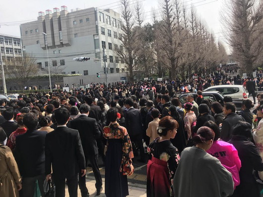 東急東横線の日吉駅前は卒業生とその家族で大賑わい。