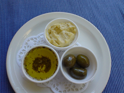 の意味)で食事の前に出されたパンとオリーブ・ペ