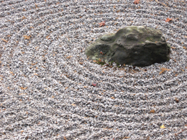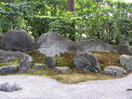 真如堂のお庭にて。左の写真は、お釈迦さまの涅槃の姿と、それを見守る弟子たちを石で表わしたところ