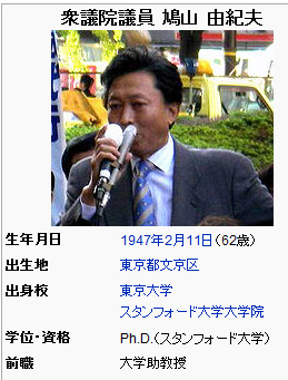 鳩山由紀夫(62歳)――9月中旬にも総理大臣に選出される見込みの、スタンフォード大で学んだ技術者。