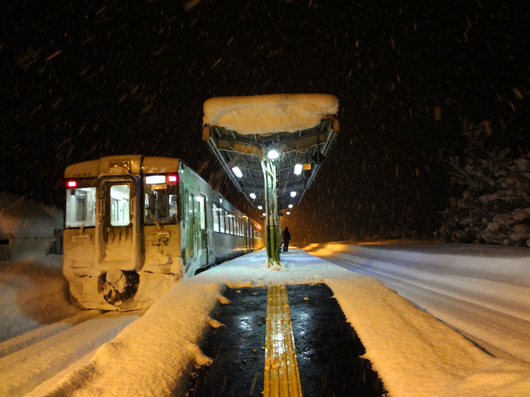 雪国の駅にて。単線です。すれ違うはずの電車が雪で遅れたため、30分間立ち往生しました |