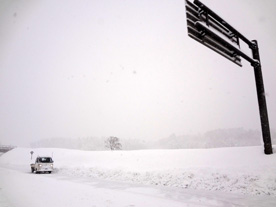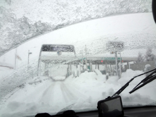 [5] 高速へ。しかし、そこに広がっているのは「こ、これが高速!? スキー場じゃなくて!?」と目が点になるほど真っ白な光景でした。ところどころアイスバーンでつるつる滑るし。恐るべし、雪国のハイウェイ。 |