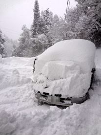 [3] 雪上車で2kmほど山を下り、ここで自家用車に乗り換えるわけですが、今年は車庫の建設が間に合わなかったため、車は野ざらし。というわけで、まずは車上に積もった雪を下ろさなければなりません。ひどいときは車が完全に雪の下に埋まってしまいどこにあるかすらわからない場合もあり、そんなときはほとんど宝探しとなります。ここで再び凍ったドアにお湯をかけ溶かす作業。
