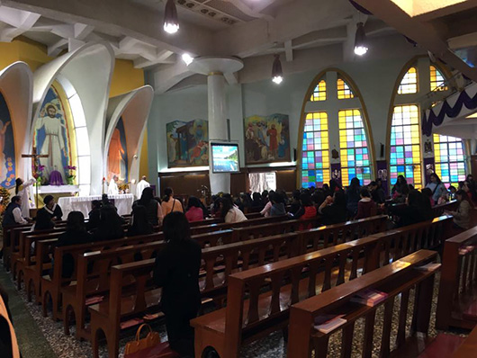教会内部。このあと続々と信者さんが詰めかけ、ほぼ満席となりました。