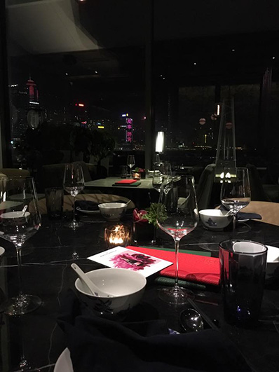 レストランが九龍島の南端に位置していたため、対岸(香港島側)の夜景を堪能しながらの「借景」ディナーとなりました。 |