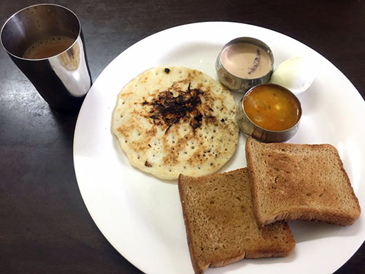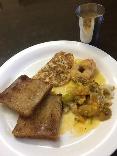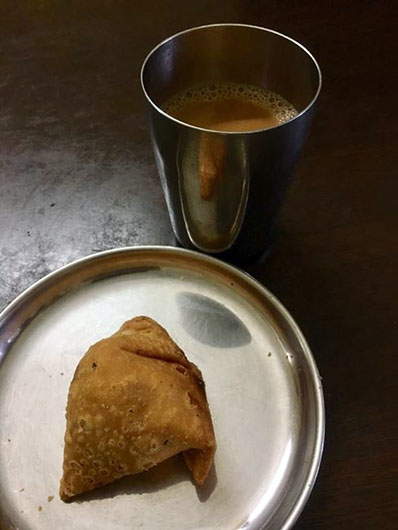 教授用の食堂にて。今日のおやつはサモサとチャイ。 |