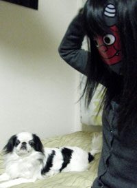 節分の豆まきで鬼に扮している