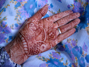 さらに職人さんに頼んで左手にメヘンディーを描いてもらった。メヘンディーとは、ヘナ(ミソハギ科の低木の一種)の葉を乾燥した粉をペースト状に練った絵具で手や足などに描く吉祥模様のこと。1週間から10日で自然に消えてしまうが、インドでは非常に縁起の良いものとされている。