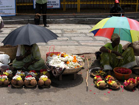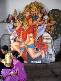 (左)ヒンドゥー寺院の前でお供え物を売る老婆2人 (右)祭事に使う神様の書き割り。大胆なタッチだ