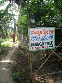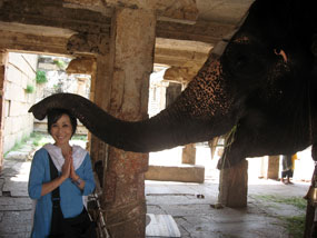 (左)レストラン“MANGO TREE”への入り口 (右)寺院の守り神として飼われている象のラクシュミーと |