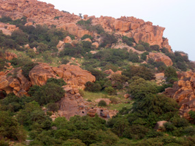 ハンピ一帯には大きな岩がゴロゴロ転がっている。遠くに見える低山も、実はたくさんの岩の塊である