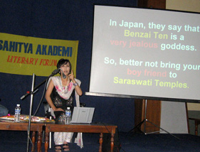 (左)インド国立文学アカデミーバンガロール支局長のバラグルムルティ氏と (右)レクチャーの