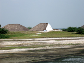 (左)ユネスコの世界遺産に指定されたマハバリプラムの遺跡にて (右)塩田と塩の山
