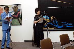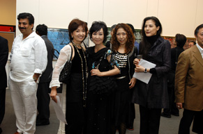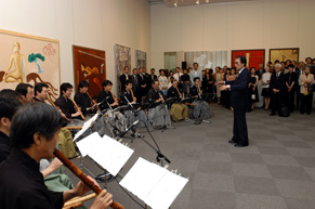 本展覧会の主催者であるS.K.モディ氏(インド国際芸術大学理事長)の挨拶から始まったレセプションは、日印芸術研究所理事長の山田真巳氏挨拶、ヘマント・クリシャン・シン駐日インド大使御祝辞、谷野作太郎元駐インド日本大使御祝辞、人間国宝・山本邦山師率いる12人のプロから成る尺八合奏団による日印国歌演奏、野澤太三元法務大臣による乾杯の御発声、そしてインド料理とインドビールを楽しんでいただきながらの歓談へと続きました。 |