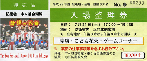 防衛省市ヶ谷自衛隊発行の「盆踊り大会入場整理券」(非売品)