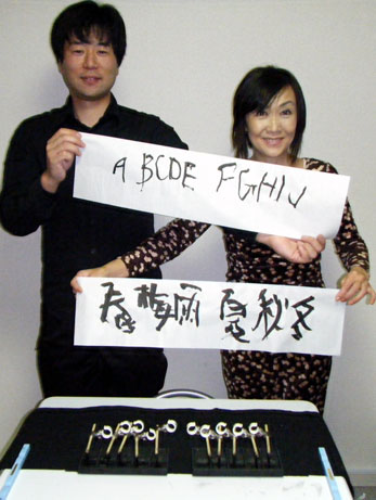 十文字折磨さんとのツーショット。6本の筆で同時書きした