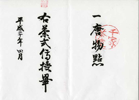 今回いただいた許状には、「一 唐物點 右茶式 伝授畢」とあります。