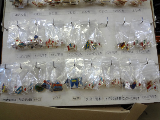 埠頭の「レクリエーションセンター」内にある売店にて。友好国と日本国の国旗が並んだバッヂ。