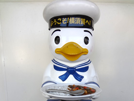 ご一緒した仲間と乗艦記念写真撮影 → JR横須賀駅出口でカレーを持って立つカモメのスカレー君
