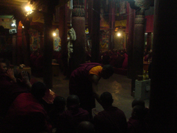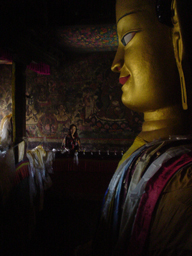 このあたりの多くのゴンパは2階建てになっており、室内に吹き抜け部分があります。そこに大きな仏像が安置されていて、1階部分からは仏像の足が、2階部分からは仏像のお顔が間近に拝めるわけです。