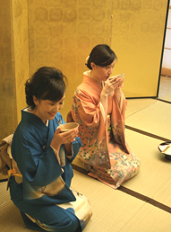 [右]「杜の里」の控え室では、さらに本格的にお食事。パパはママの勧めで“のり巻き”に初挑戦