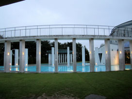 「七ヶ浜国際村」のエントランス付近の様子。水をふんだんに使った神殿風の建築物が魅力的です