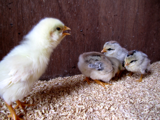 ここ数日のあいだに我が家で孵った4羽のひよこ。左端の子の名前は「BOSS」に決定(笑)。