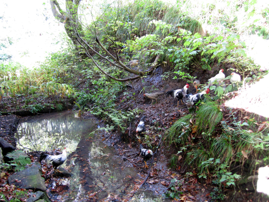 昼間は放し飼い状態の12羽のニワトリたち。かなり野生化が進んでおりますが(笑)